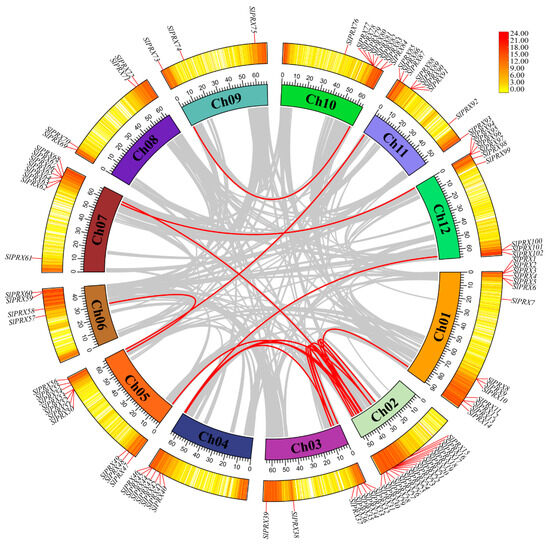 The interchromosomal collinearity relationships of SlPRX genes. The syntenic map was visualized using TBtools-II. The outer circle indicates gene density, which is represented by a yellow-to-red color scheme, with a redder color denoting a higher level of gene density. Gray lines connect syntenic genomic regions, and red lines highlight collinear SlPRX gene pairs.