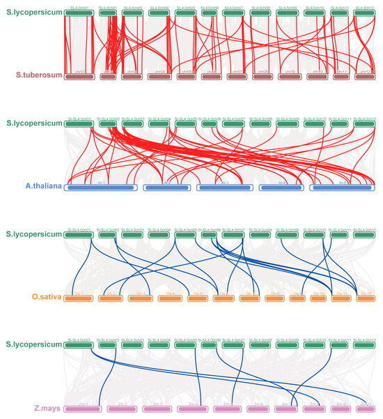 The interspecific collinearity relationships of PRX genes. The syntenic relationships of PRX genes with tomato and four other plant species (potato, Arabidopsis, rice, and maize), visualized by using TBtools-II. Gray lines represent background syntenic blocks. Red lines connect collinear PRX gene pairs with tomato and other dicots (potato, Arabidopsis), and blue lines connect tomato with monocots (rice, maize).