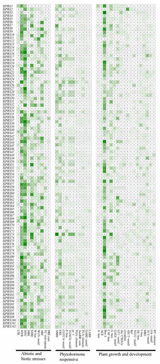 Putative regulatory cis-elements in the promoters of SlPRX genes. Blocks with different colors and quantities represent the number of different elements contained within the 2000 bp upstream region of each SlPRX. The detailed information for each cis-element is available in Supplementary Table S3. The intensity of green color represents the number of cis-elements, with darker shades denoting higher values.