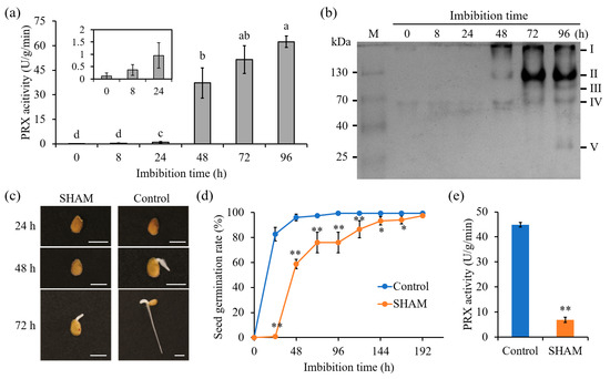 SlPRXs are involved in tomato seed germination. (a) Dynamic changes in PRX enzyme activity during tomato seed germination. Different lowercase letters in the graphs indicate significant differences between different time points as determined by one-way ANOVA (p < 0.05). (b) The detection of PRX isozymes in germinating tomato seeds. The Roman numerals I–V represent the five PRX isozymes. (c,d) The effects of SHAM on tomato seed germination phenotypes (c) and germination rate. Scale bars in (c) indicate 5 mm. (e) PRX activity was drastically inhibited in SHAM-treated seeds. The data in (d,e) are presented as the mean ± SD, and asterisks indicate significant differences compared with the control according to Student’s t-test (* p < 0.05, ** p < 0.01).