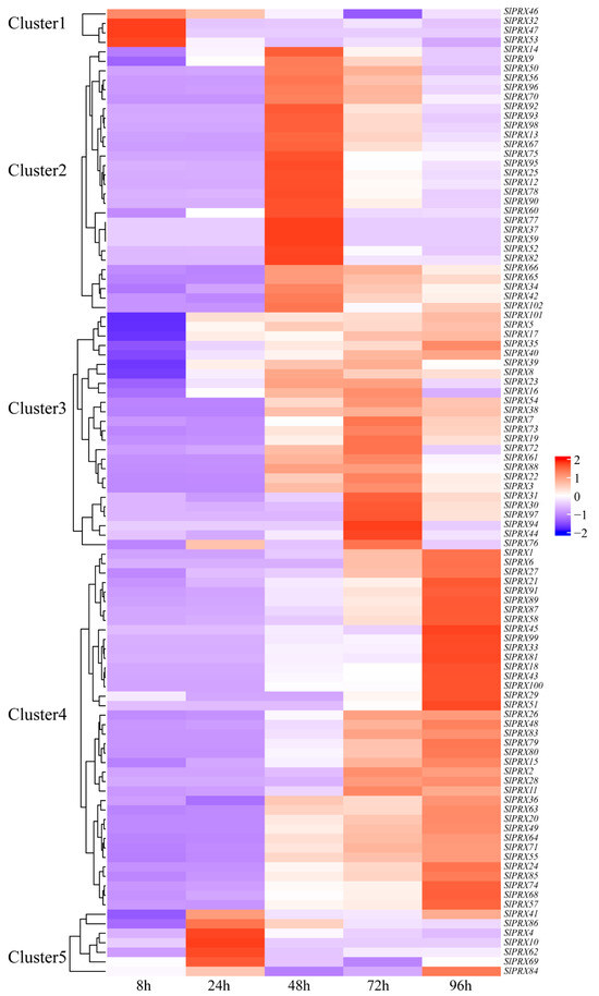 To characterize the functions of SlPRX members in tomato seed germination, RNA-seq analysis was carried out at different germination time points (8, 24, 48, 72, and 96 h). Figure 9 shows that all the 102 SlPRX genes were expressed during tomato seed germination, but with different patterns. The 102 SlPRX genes were classified into five clusters according to their expression patterns. Cluster 1 contained four genes, SlPRX32, SlPRX46, SlPRX47, and SlPRX53, which were only highly expressed as early as 8 h after seed germination. A total of 28 SlPRX genes were classified as Cluster 2, whose expression levels peaked at 48 h of seed germination. Cluster 3 contained 25 SlPRX genes. The expression levels of Cluster 3 genes increased at 48 h, peaked at 72 h, and then declined. A total of 38 SlPRX genes were classified as Cluster 4, which is the largest cluster. The genes in Cluster 4 increased at 24 or 48 h of seed germination, and remained elevated for the following 48 h. In Cluster 5, seven SlPRX genes were included. Of them, five genes (SlPRX4, SlPRX10, SlPRX62, SlPRX69, and SlPRX86) were highly expressed at only 24 h, and two genes (SlPRX41 and SlPRX84) showed high expression levels at 24 and 96 h (Figure 9). Moreover, the expression dynamics of nine SlPRX genes from different clusters were validated by qRT-PCR. These genes displayed expression patterns consistent with the results of transcriptome analysis (Figure 10). Taken together, these results indicate that tomato seed germination is finely controlled by coordination and relay between multiple SlPRX genes.