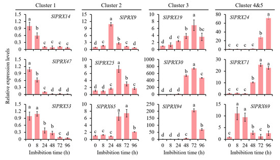 qRT-PCR validation of the expression of selected SlPRX genes during tomato seed germination. The expression level at 0 h was set to 1.0 for each gene. Different lowercase letters for each gene indicate statistically significant changes in expression levels across the time courses (p < 0.05).