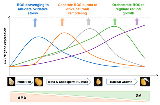A schematic model of the proposed SlPRX–ROS–hormone interplay during tomato seed germination. The temporal expression of five SlPRX gene clusters across three key germination phases is depicted, highlighting how PRXs fine-tune the oxidative window to regulate processes from imbibition to radicle growth.