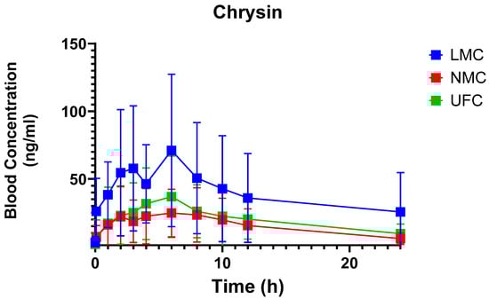 Figure 5. Mean plasma concentration–time profiles of chrysin following single oral administration of three formulations: micellar lipid matrix chrysin (LMC), non-micellar chrysin (NMC), and unformulated chrysin (UFC). Data are presented as mean ± SD (n = 13–16 per time point).