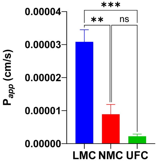 Figure 6. Bar graph showing the mean ± standard deviation of apparent permeability coefficients (Papp) for three chrysin formulations—LMC, NMC, and UFC—across Caco-2 monolayers (n = 3 per group). The LMC formulation demonstrated significantly higher permeability than both NMC and UFC, suggesting enhanced potential for intestinal absorption. One-way ANOVA with Tukey post hoc correction. ns = not significant; ** p < 0.01; *** p < 0.001.