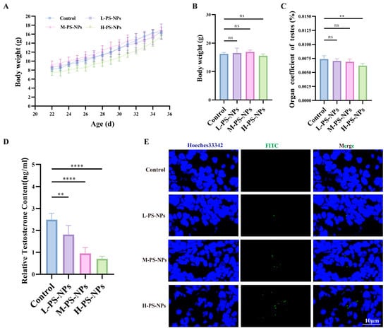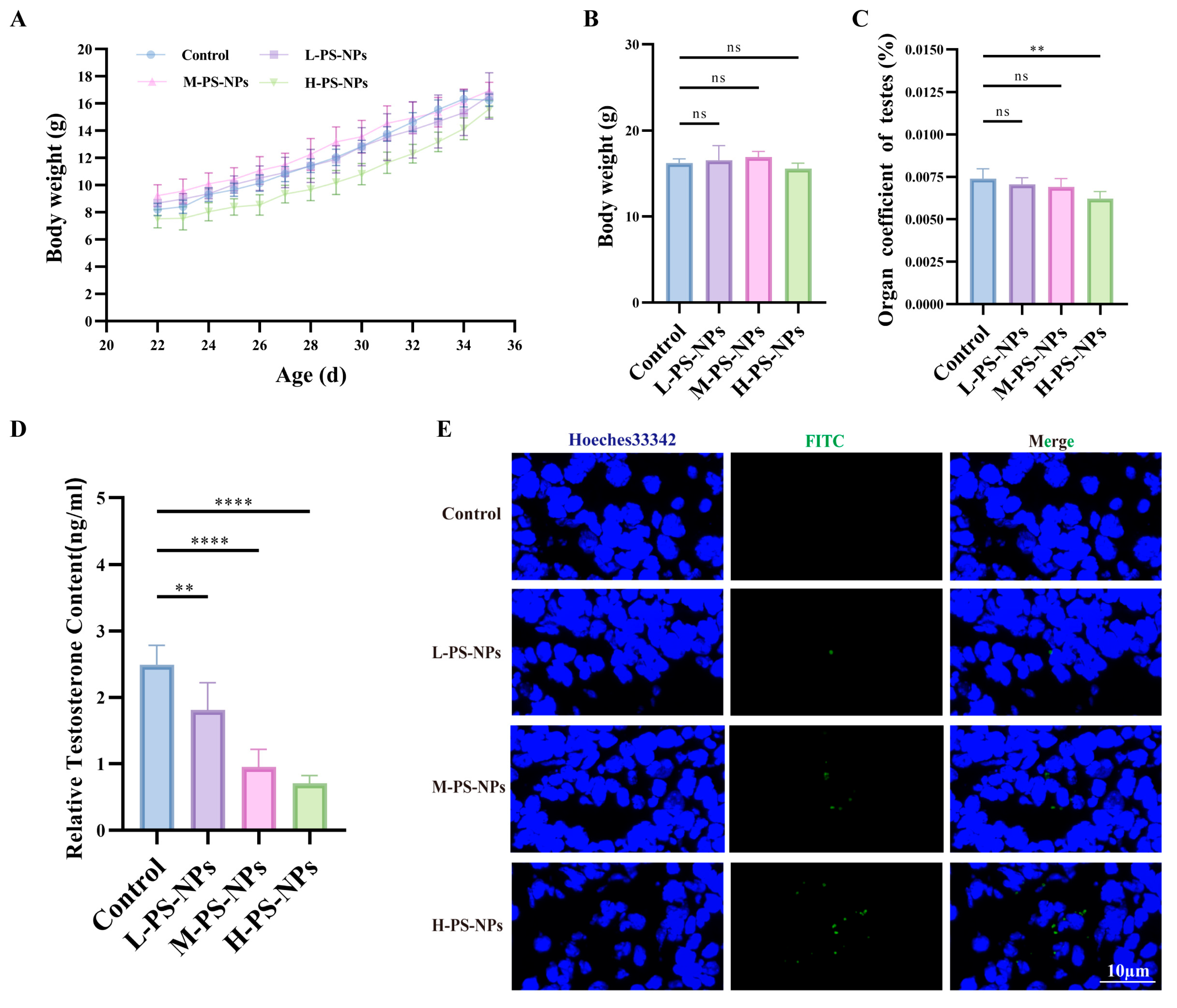 PS-NPs exposure on testicular health in immature mice. (A,B) Demonstrate no significant differences in body weight across the four groups (n = 10). (C) Indicates a reduction in the testis-to-body weight ratio in the high-dose group following PS-NPs exposure (n = 10). (D) Reveals a decline in serum testosterone levels, which is particularly pronounced in the high-dose group (n = 10). (E) Shows the accumulation of PS-NPs in testicular tissue via frozen sectioning. Statistical significance is denoted as ** p < 0.01, **** p < 0.0001.