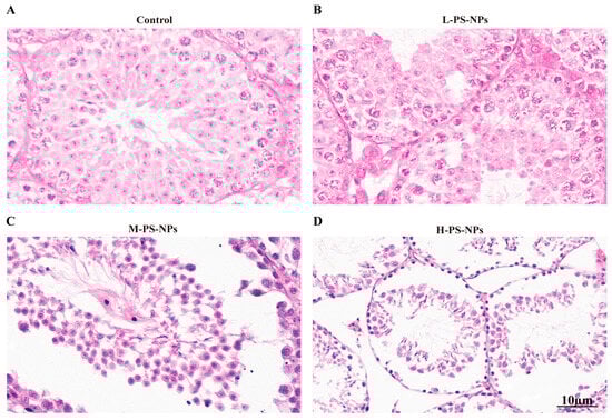 Effect of PS-NPs exposure on testicular pathology in immature mice. (A) The H&E staining of control testes displayed intact and well-organized seminiferous epithelia. (B) The low-dose group showed mild vacuolization in spermatogenic cells. (C) The medium-dose group exhibited pronounced vacuolization, seminiferous tubule atrophy, and interstitial expansion. (D) The high-dose group exhibited severe interstitial edema and pronounced seminiferous tubule atrophy.