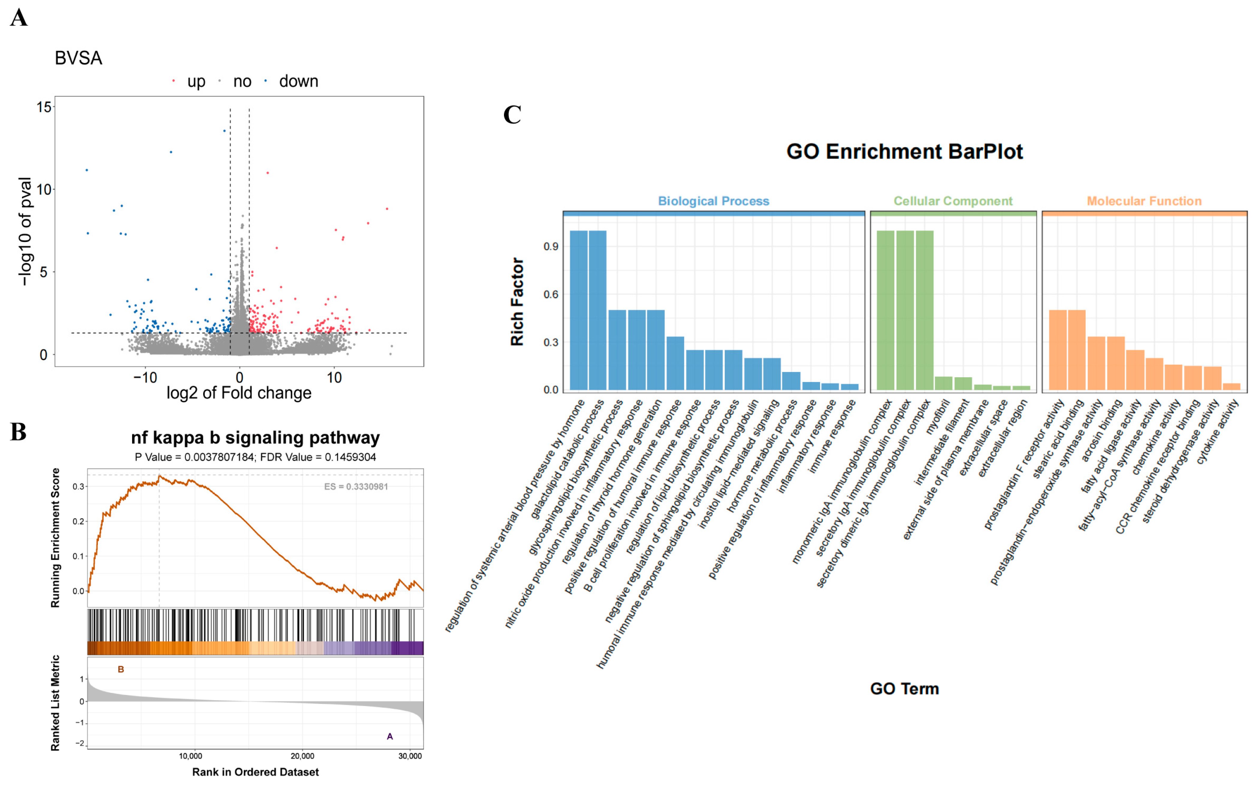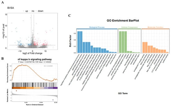Transcriptomic analysis of control versus PS-NPs groups. (A) The volcano plot illustrates the DEGs between the control and PS-NPs groups, 174 upregulated and 112 downregulated genes (n = 3). (B) GO functional annotation enrichment analysis of DEGs. (C) GSEA revealed significant enrichment of the NF-κB signaling pathway among the DEGs.