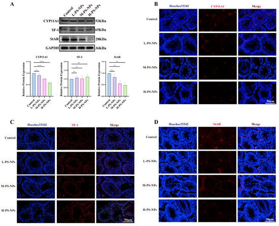 Western blotting was then applied to assess proteins involved in testosterone biosynthesis. CYP11A1 and StAR showed dose-dependent decreases with increasing PS-NP exposure, whereas SF-1 expression remained unchanged (Figure 6A). Immunofluorescence assays confirmed these findings, showing reduced CYP11A1 and StAR staining intensity in exposed testes (Figure 6B–D). Collectively, these results indicate that PS-NP exposure suppresses testosterone synthesis and contributes to germ cell injury in immature mice.