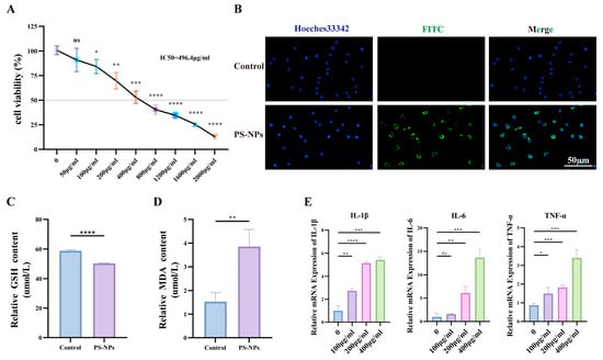 PS-NPs exposure can damage the TM3 cell line. (A) Exposure to varying concentrations of PS-NPs for 24 h resulted in a concentration-dependent inhibition of TM3 cell proliferation. (B) Morphological assessment of TM3 cell lines following PS-NPs treatment. (C) Alterations in GSH levels post PS-NPs exposure (n = 3). (D) Modifications in MDA levels subsequent to PS-NPs treatment (n = 3). (E) Expression analysis of mRNA for inflammation-related genes in TM3 cell lines (n = 3). Statistical significance is denoted as * p < 0.05, ** p < 0.01, *** p < 0.001, **** p < 0.0001.