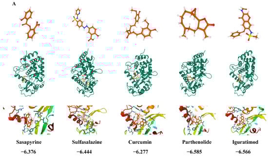 The Connectivity Map (CMap) is a comprehensive bioinformatics database that links small-molecule drugs, genes, and diseases through large-scale gene expression profiling [,]. Using CMap (https://clue.io/, 11 May 2025), potential prophylactic drugs for PS-NP-induced testicular injury were predicted by identifying small-molecule compounds with negative connectivity scores and evaluating their potential interaction sites with target proteins. This strategy enables the discovery of therapeutically promising compounds by comparing drug-induced gene expression signatures with those associated with testicular injury. Candidate compounds identified through CMap analysis were further evaluated by molecular docking and molecular dynamics simulations to predict their binding modes with target proteins. A high binding energy implies that the intermolecular interactions are weak and unstable. Moderate binding energy, ranging from −3 to −5 kcal/mol, suggests some level of stability but might require further optimization. A low binding energy, specifically below −5 kcal/mol, indicates strong and stable interactions, which are optimal for drug design as they forecast a tighter binding between a ligand and its target protein, suggesting increased therapeutic potential [,,].
