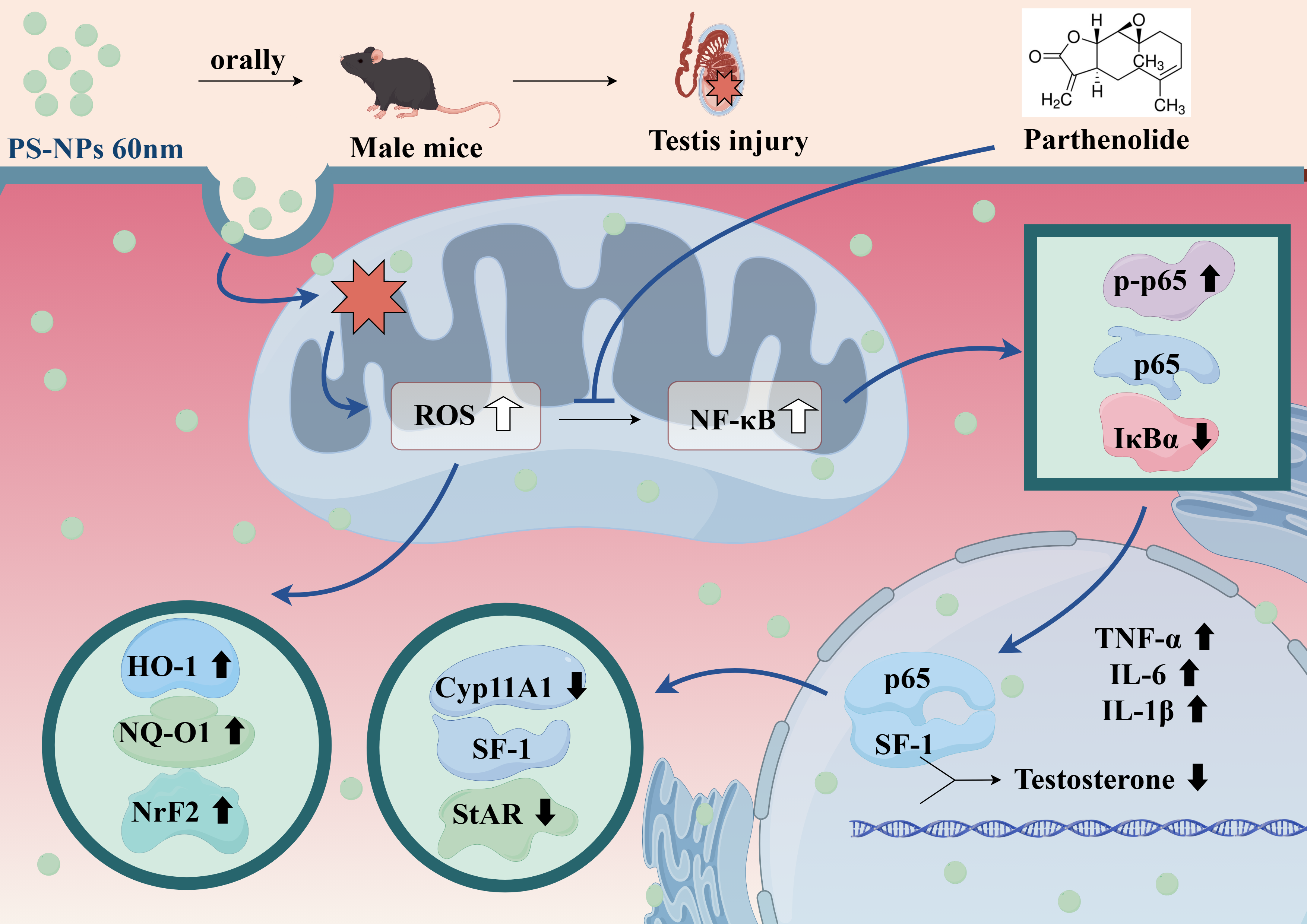 Here, we established in vivo and in vitro models of PS-NP exposure to interrogate the mechanisms underlying immature testicular injury. We focused on the ROS–NF-κB axis as a putative driver of steroidogenic dysfunction and evaluated its impact on testosterone biosynthesis. We further tested PTL, a sesquiterpene lactone, as a targeted intervention to inhibit ROS-driven NF-κB nuclear translocation and to rescue PS-NP-induced defects in testicular function.