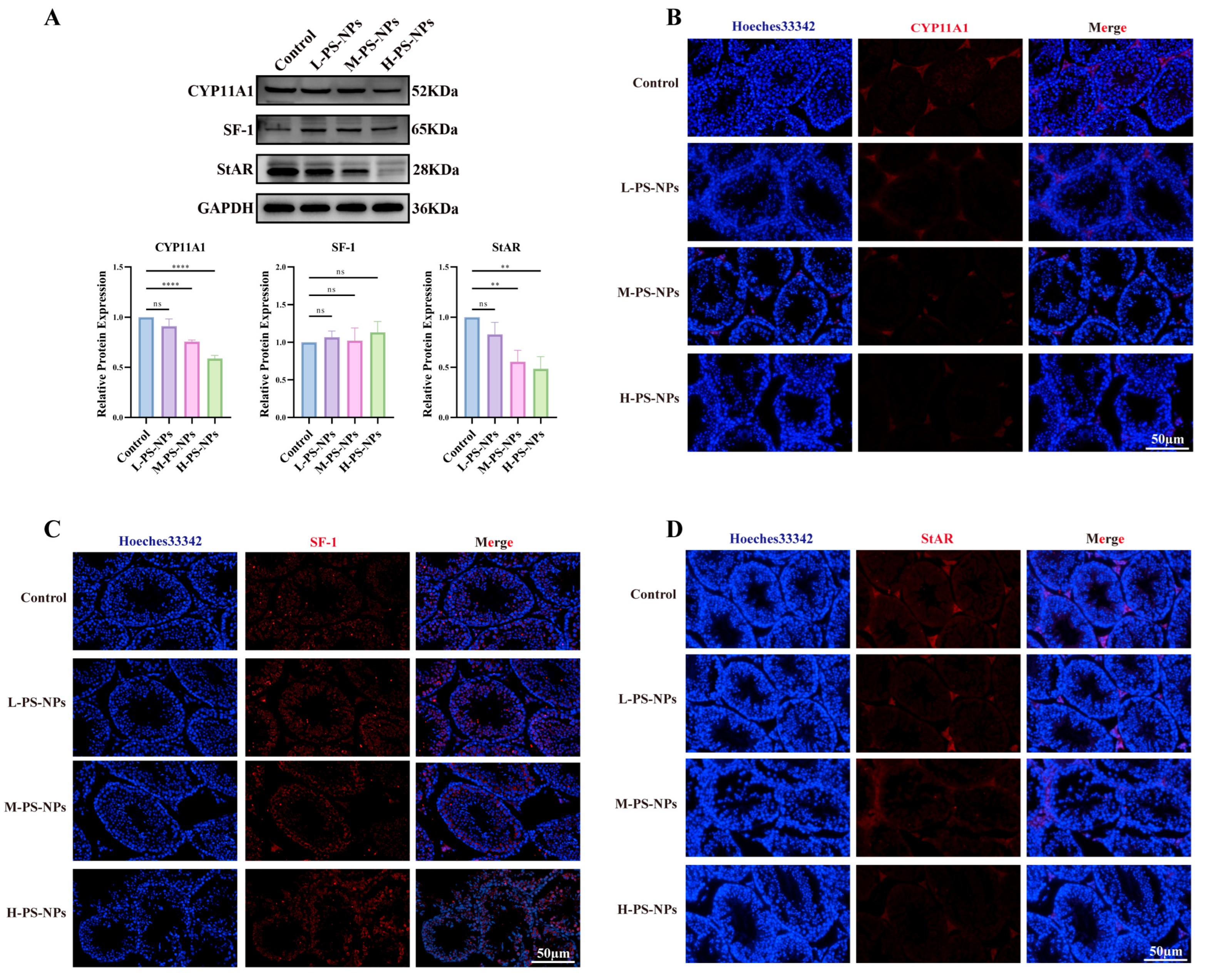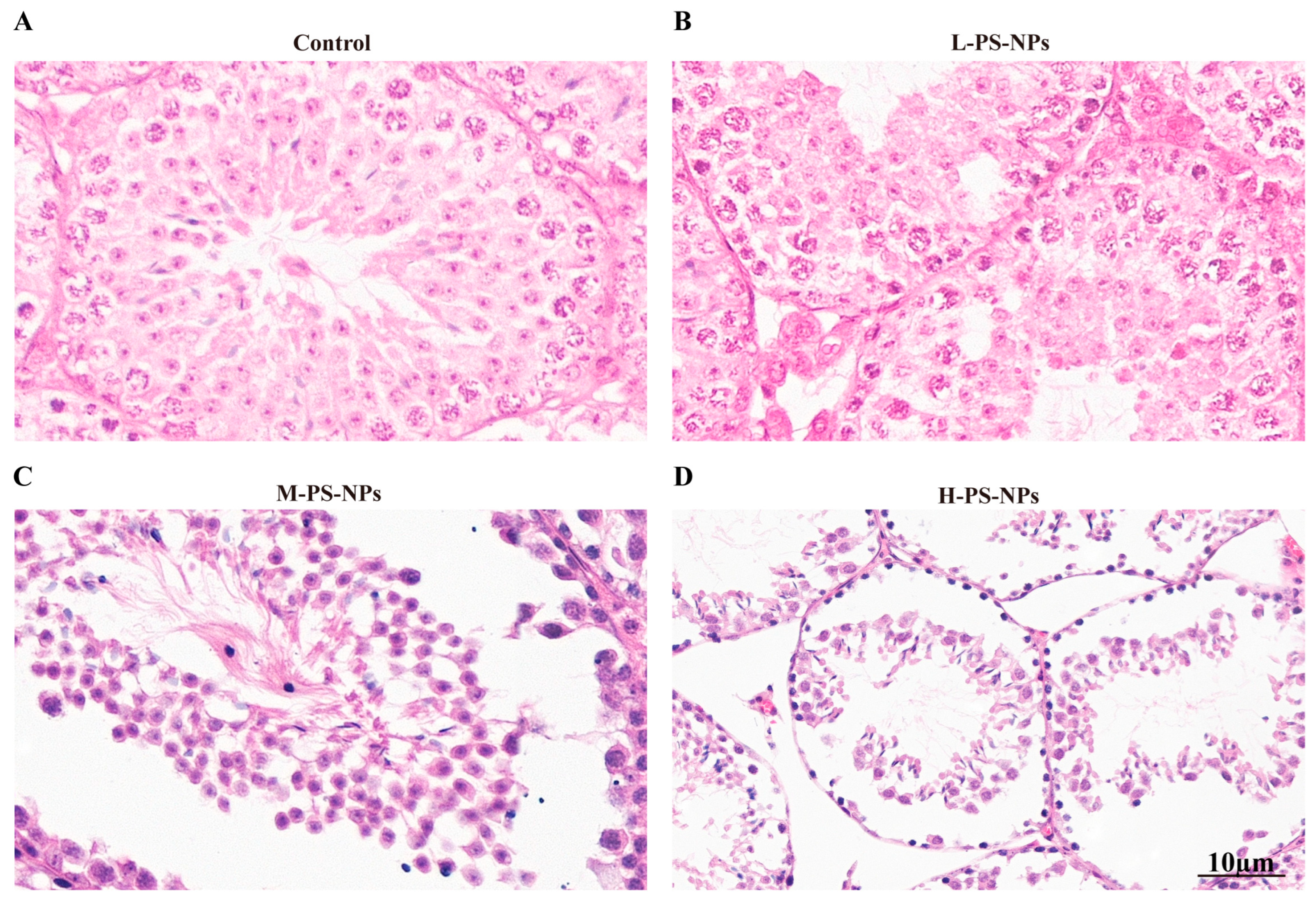 Together, these results demonstrate that PS-NP exposure induces dose-dependent testicular damage in immature mice, reflected in both histopathological alterations and functional impairment.