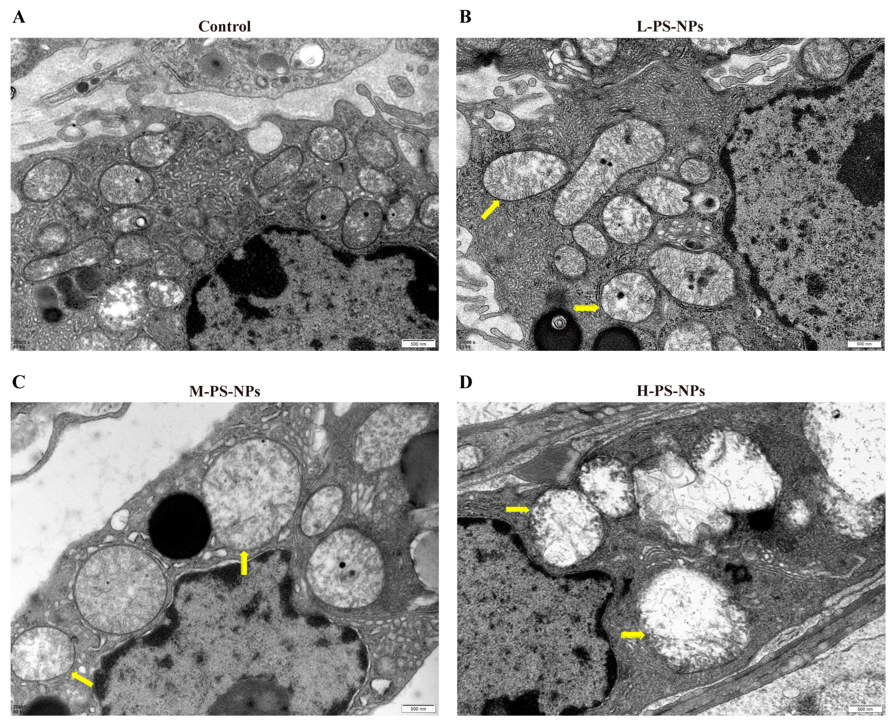 Effect of PS-NPs exposure on testicular ultrastructure in immature mice. (A) Provides TEM ultrastructural evidence that controls exhibited intact mitochondria and preserved organelles. (B) In the low-dose group, mitochondria showed partial matrix clearing and mild cristae swelling. (C) The medium-dose group exhibited a cloudy matrix with fragmented and shortened cristae. (D) In the high-dose group, the matrix was fully cleared and cristae were disintegrated, with yellow arrows indicating damaged mitochondria.