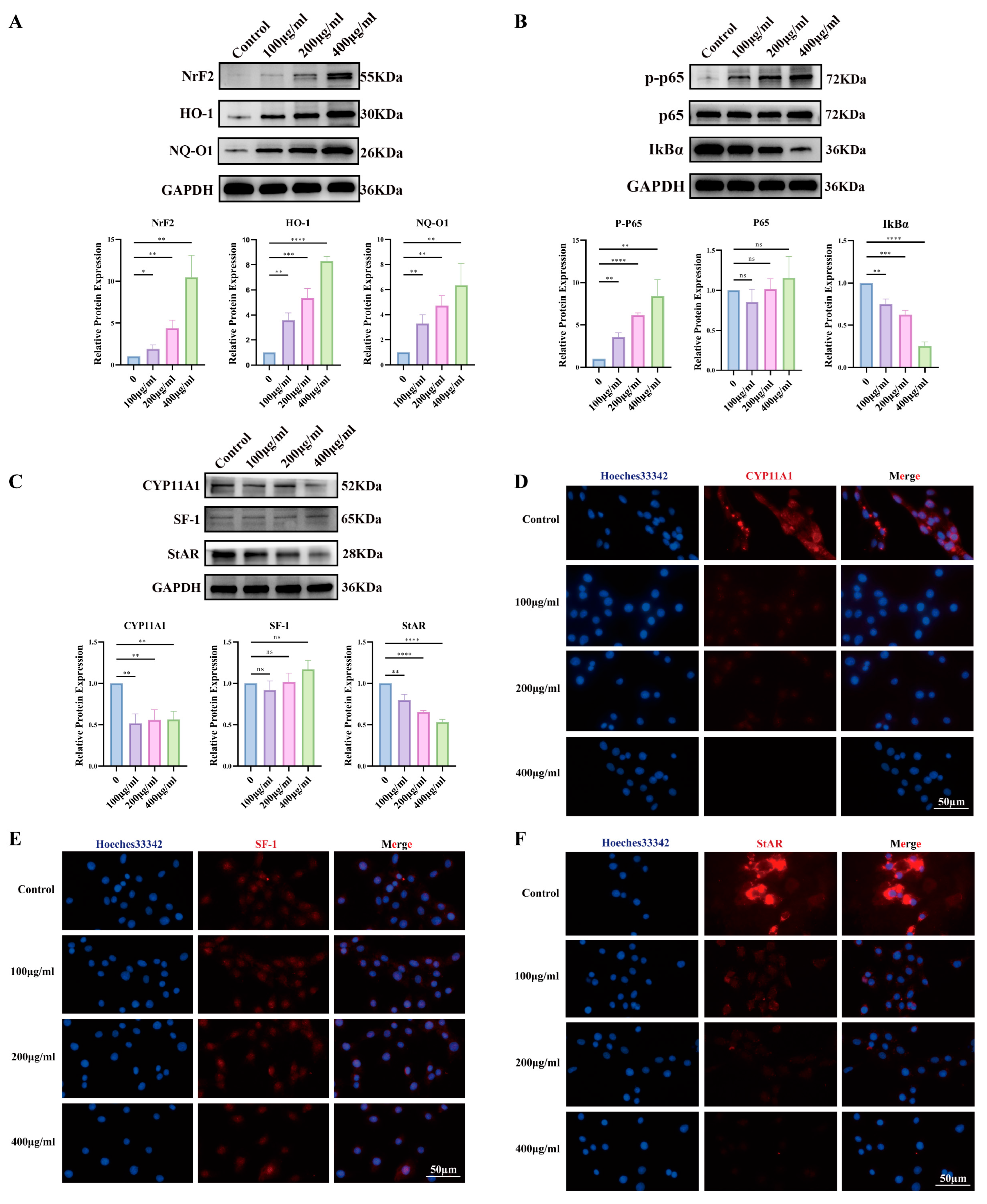 Steroidogenic markers showed dose-dependent decreases in CYP11A1 and StAR, whereas SF-1 remained unchanged (Figure 8C). IF corroborated these results, showing reduced CYP11A1 (Figure 8D) and StAR (Figure 8E) signals across doses, while SF-1 was stable (Figure 8F). Collectively, PS-NPs activate ROS/NF-κB signaling in TM3 cells and blunt testosterone biosynthesis.