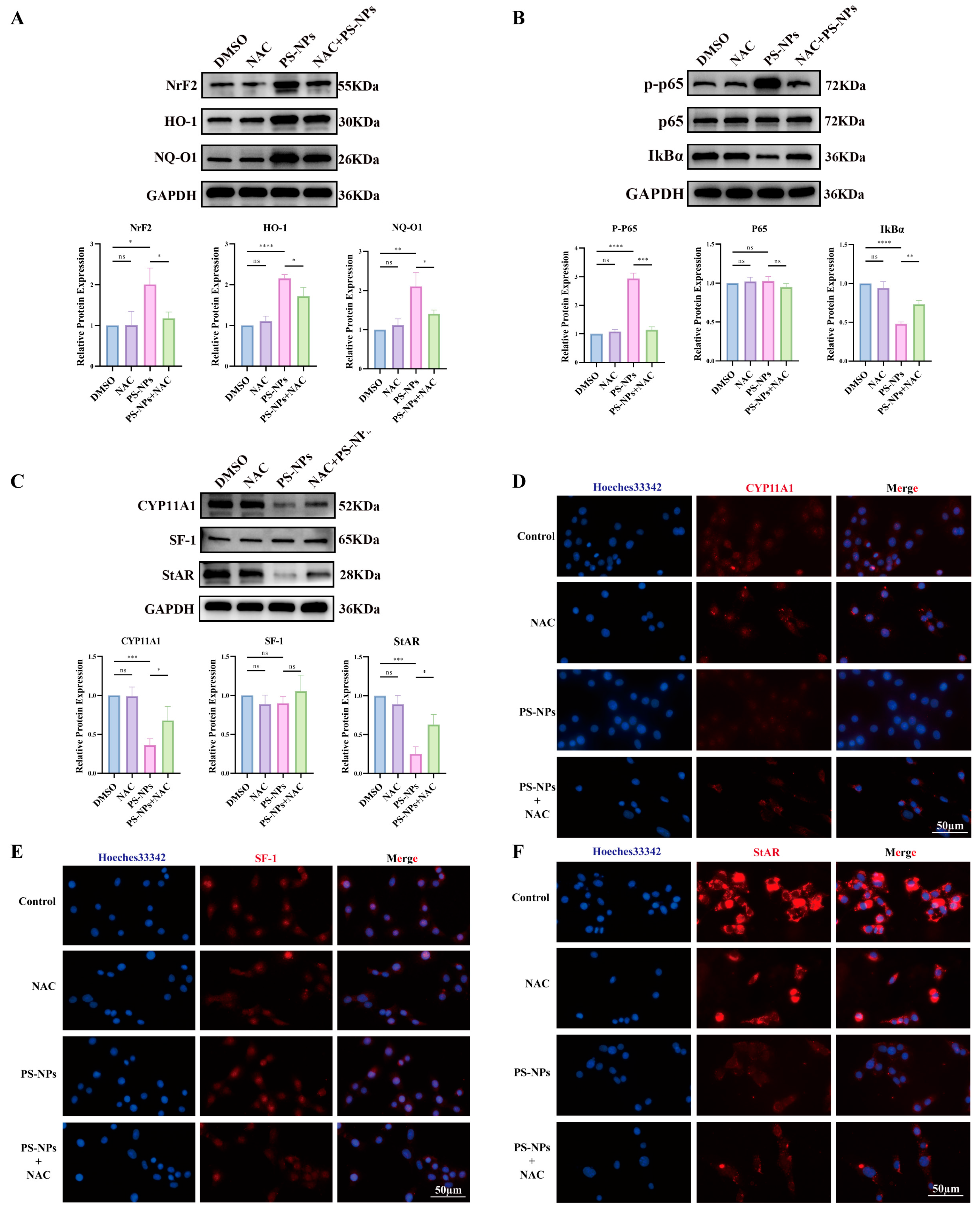 To test whether quenching ROS rescues steroidogenesis, NAC (10 mM) was applied during PS-NPs exposure. NAC reduced oxidative-stress protein levels (Figure 9A), suppressed NF-κB activation (Figure 9B), and upregulated steroidogenic proteins (Figure 9C). IF corroborated these results, showing increased CYP11A1, SF-1, and StAR signals in NAC-treated cells compared with PS-NPs alone (Figure 9D–F). Collectively, NAC attenuates PS-NP-driven ROS/NF-κB signaling and partially restores testosterone biosynthesis.