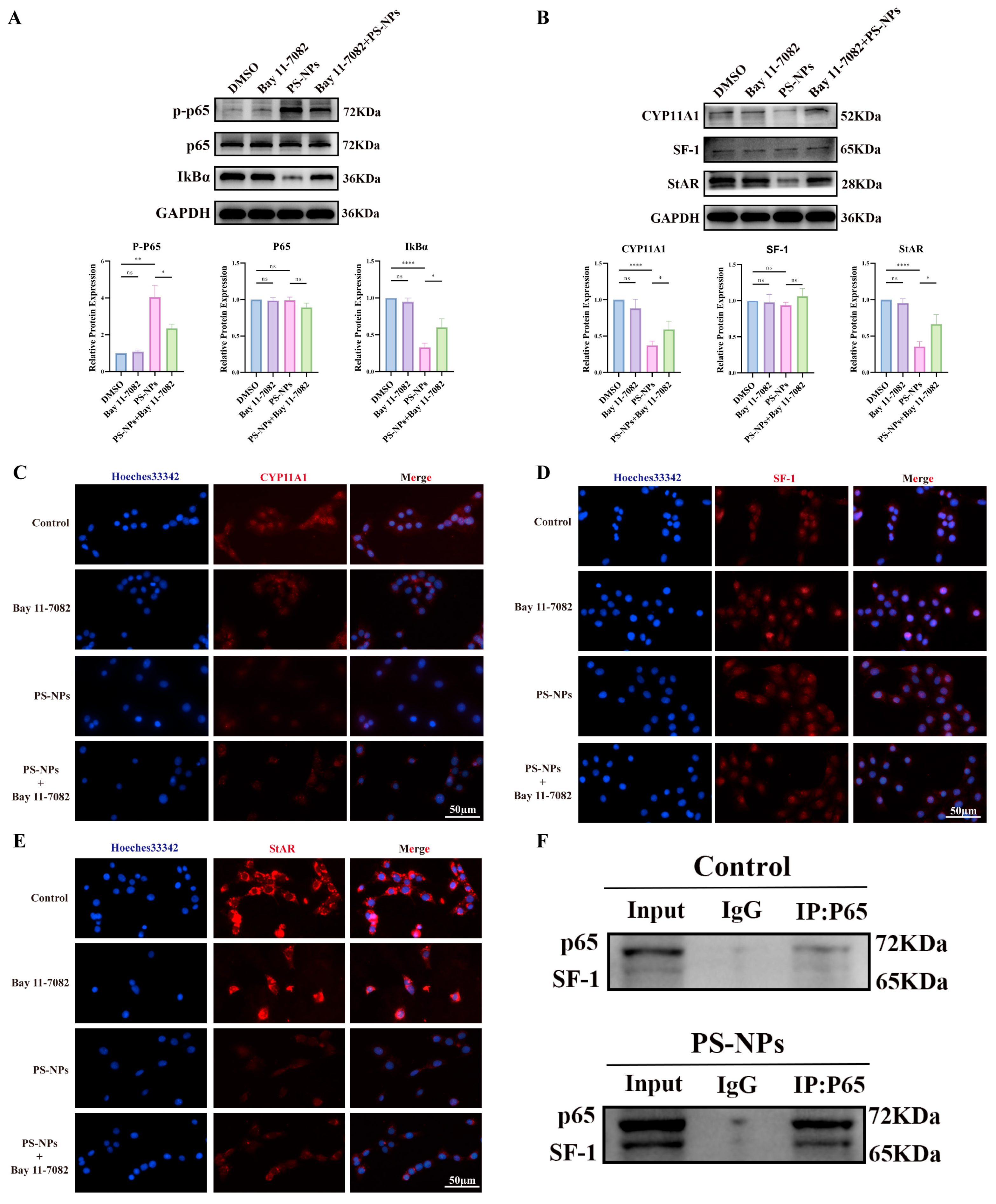 To further test the role of NF-κB in steroidogenesis, Bay 11-7082 (5 μM) was applied during PS-NPs exposure. Bay 11-7082 suppressed NF-κB activation (Figure 10A) and increased steroidogenic protein expression (Figure 10B). IF confirmed higher levels of CYP11A1, SF-1, and StAR in Bay 11-7082-treated cells compared with PS-NPs alone (Figure 10C–E). These results indicate that Bay 11-7082 mitigates PS-NP-induced NF-κB signaling and restores testosterone production.