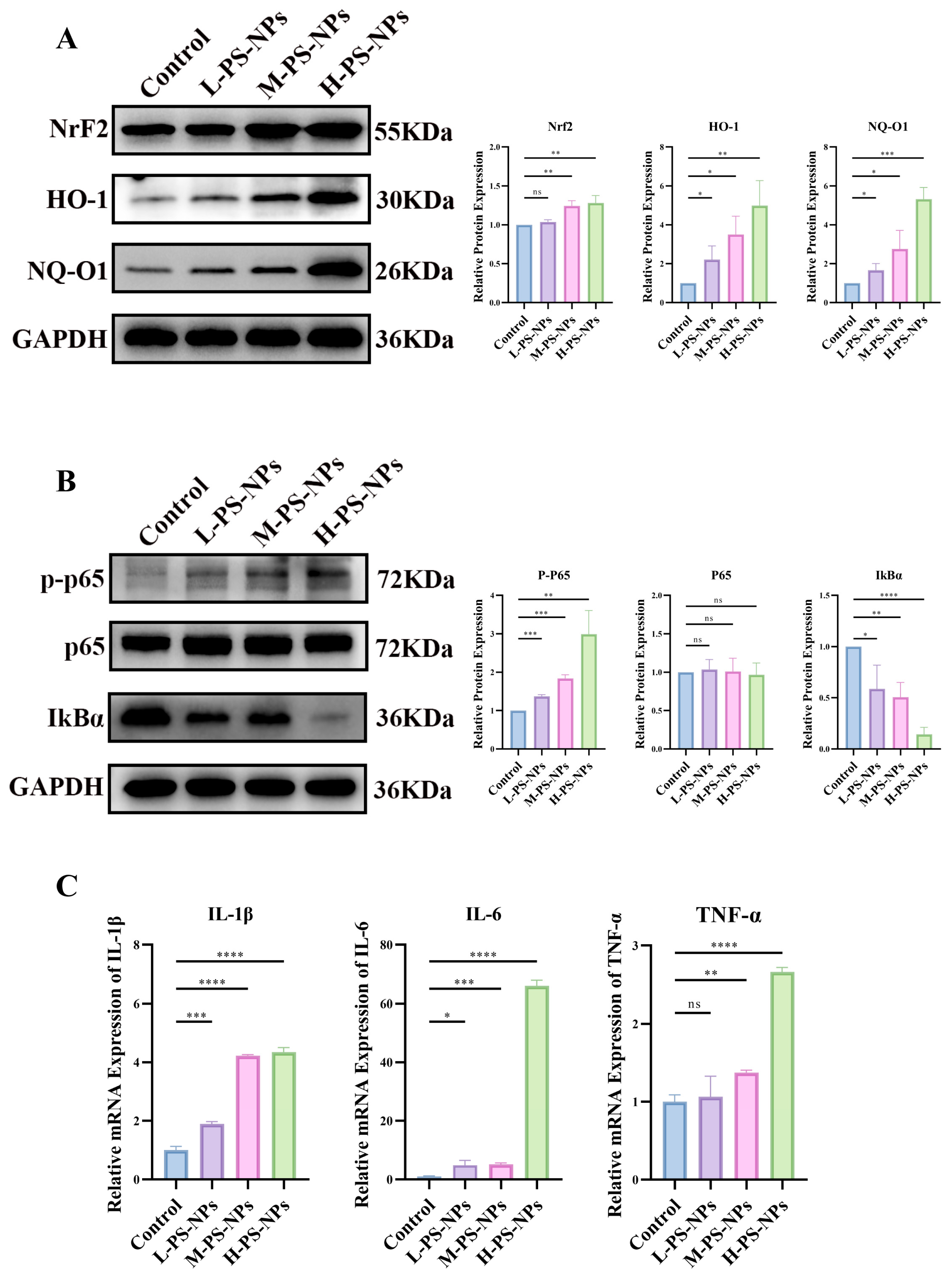 Consistent with prior reports []. We assessed ROS-related signaling in testes after PS-NP exposure. Relative to controls, increasing PS-NP doses elicited stepwise upregulation of NRF2, HO-1, and NQO1 in testicular tissue, indicating a dose-dependent ROS response (Figure 11A). Guided by the transcriptomic findings, we next examined NF-κB activity. PS-NPs increased p-p65 and decreased IκBα compared with controls, confirming NF-κB activation in testes (Figure 11B). In parallel, transcripts of pro-inflammatory genes were elevated in germ cells following PS-NPs exposure (Figure 11C). Together, these data demonstrate that PS-NPs trigger a ROS surge and activate NF-κB signaling in immature testicular tissue.