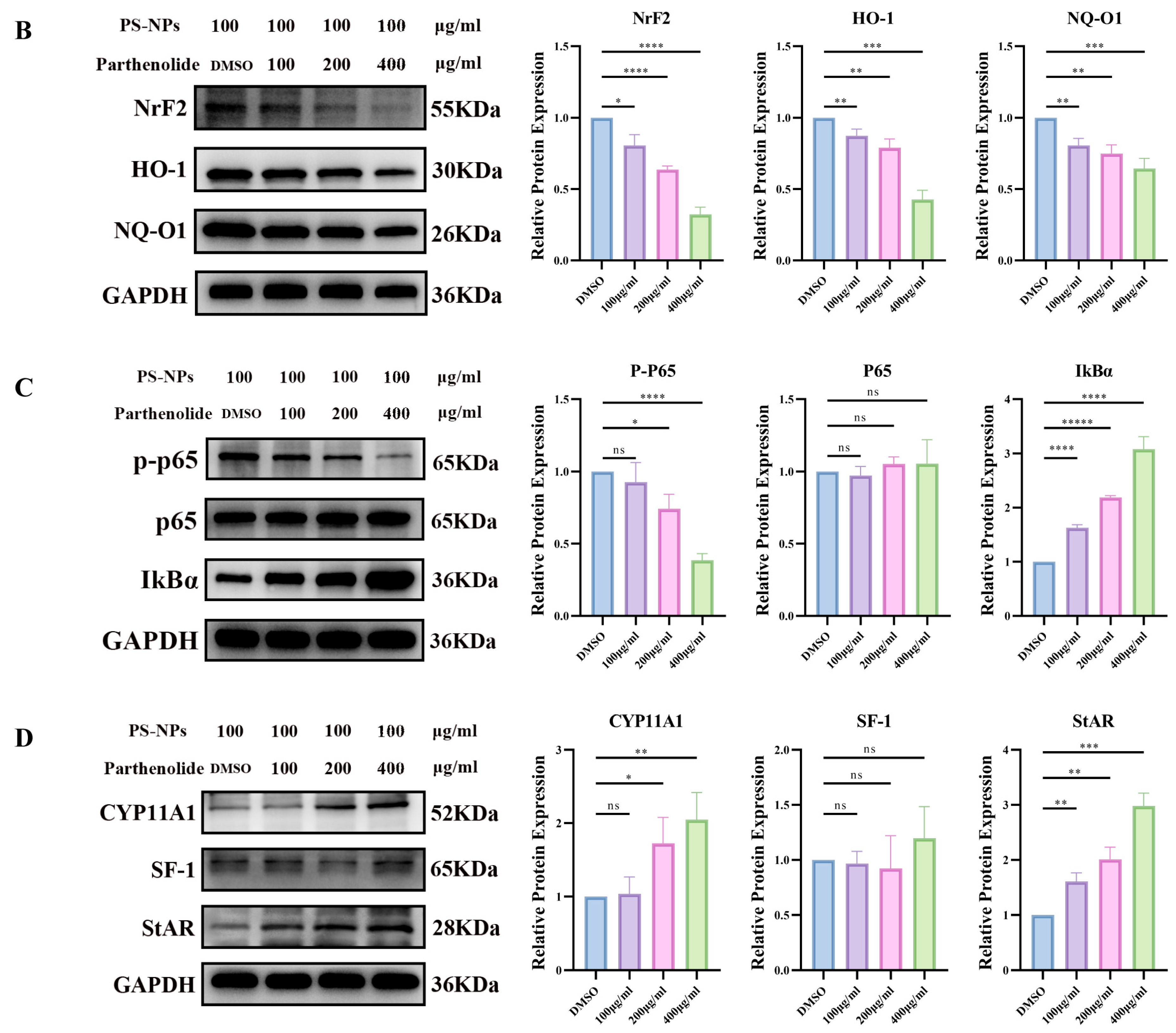 In TM3 cells pre-exposed to PS-NPs (100 μg/mL), PTL given over graded doses reduced oxidative-stress markers (WB; Figure 12B), suppressed NF-κB activation (WB; Figure 12C), and restored testosterone output (WB; Figure 12D). Collectively, these data support PTL as a candidate to counter PS-NP-induced reproductive injury.