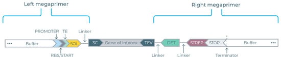 Linear DNAs encoding the BvPgb GOIs were inserted between two flanking megaprimers (see Figure 2) to create complete eGene constructs. Eight different left megaprimers were employed to generate the P17, CUSF, FH8, TRX, ZZ, SUMO, SNUT, and untagged eGenes. The right megaprimer includes the DET and STREP tags.