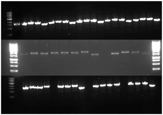 PCR products of the constructed eGenes™. Top, left to right: Ladder, control, AsPgb 1.1 with SOL tags P17, CUSF, FH8, and none, and the same for C70A, C84A, AsPgb 3.1, and C161A. Middle, left to right: Ladder, BvPgb 1.2 with SOL tags P17, CUSF, FH8, TRX, ZZ, SUMO, SNUT, none, and space; AsPgb 1.5 with SOL tags P17, CUSF, FH8, none, and ladder. Bottom: Ladder, C86A with SOL tags (from left to right) P17, CUSF, FH8, TRX, space, ZZ, SUMO, SNUT, none, and space, and the same for H-NOX.
