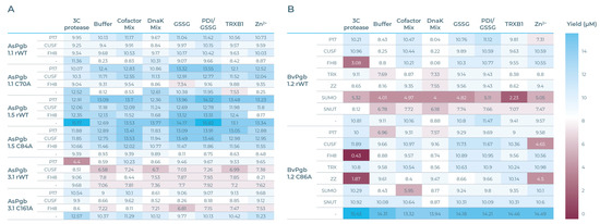 Heat maps of expression yields (µM), with blue and red cells having yields above or below 8 µM, respectively. (A) AsPgb heatmap, with SOL-tagged POI constructs to the left, in order P17, CUSF, FH8, and none (-). From top to bottom, AsPgb 1.1 rWT, C70A, AsPgb 1.5 rWT, C84A, AsPgb 3.1 rWT, and C161A. CFBs top, from left to right are ordered by 3C protease, buffer, cofactor mix, DnaK mix, glutathione disulfide (GSSG), GSSG mixed with protein disulfide isomerase (PDI/GSSG), thioredoxin reductase (TRXB1), and Zn2+. (B) BvPgb heatmap, with SOL-tagged POI constructs in order P17, CUSF, FH8, TRX, ZZ, SUMO, SNUT, and -. Topmost half are the BvPgb 1.2 rWT constructs and bottom half are the C86A constructs. CFBs are ordered the same as in (A). See Table S2 for detailed data.