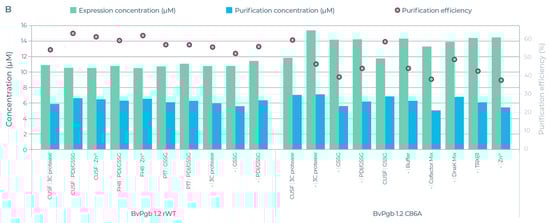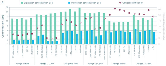 The five AsPgb and ten BvPgb compositions with the highest yields (see Table S2 for full data) were selected for downstream strep-based purification (see Figure 6). Here too, alanine substitution appeared to have a big effect. For example, the lower purification efficiency of the C86A variant was compensated by its high expression yields, giving a comparative yield to that of its parental BvPgb rWT (see Figure 6B). Conversely, the high purification efficiency for class 3 AsPgbs outweighed their low expression when compared to the other AsPgbs (see Figure 6A).