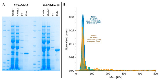 MP measurements of BvPgb had 93% of counts at 43 ± 6.5 kDa, whereas AsPgb had 72% of counts at 41 ± 6.5 kDa, suggesting that both POIs were obtained in a monomeric state (see Figure 7B). The higher-than-expected mass as reported by MP can be explained by known instrumental upward biases for molecules near the lower detection limit of 30 kDa [50,51].