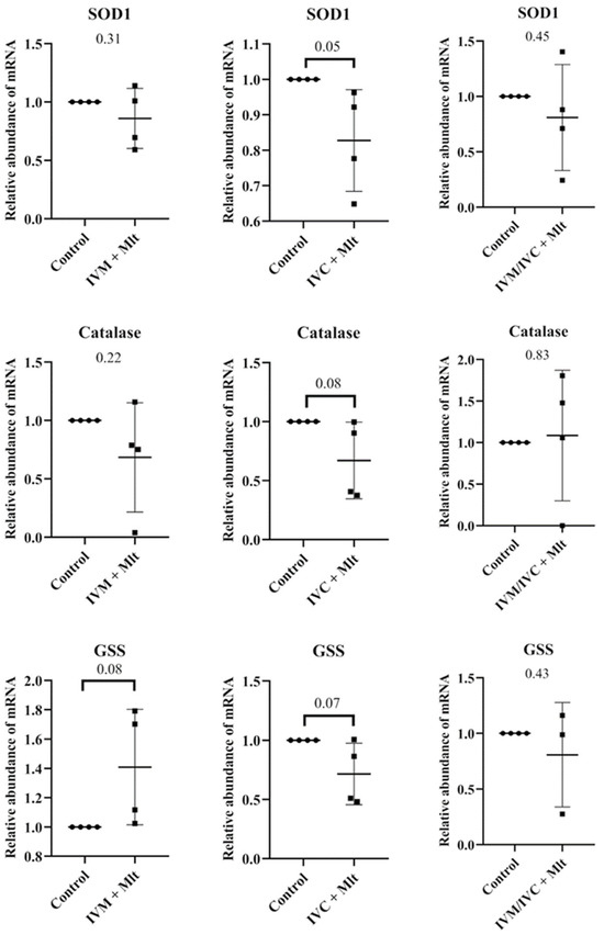 Comparison of each melatonin-treated group individually to the control revealed distinct expression patterns of oxidative stress-related genes (SOD1, CAT, and GSS) (Figure 4). The IVC + Mlt group showed lower transcript levels of SOD1, CAT, and GSS than the control (p < 0.10), whereas the IVM + Mlt group exhibited increased expression of GSS (p < 0.10).