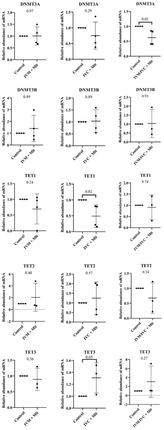 In contrast, the genes related to epigenetic reprogramming (TET1, TET2, TET3, DNMT3A, and DNMT3B) (Figure 6) showed differences between the control group and each of the melatonin-treated groups. The mRNA levels of TET1 were lower in the IVC + Mlt group (p < 0.05) compared to the control group, whereas TET3 levels were higher in the IVC + Mlt group (p ≤ 0.05). Additionally, DNMT3A mRNA levels were lower in the IVM/IVC + Mlt group than in the control group (p < 0.05).