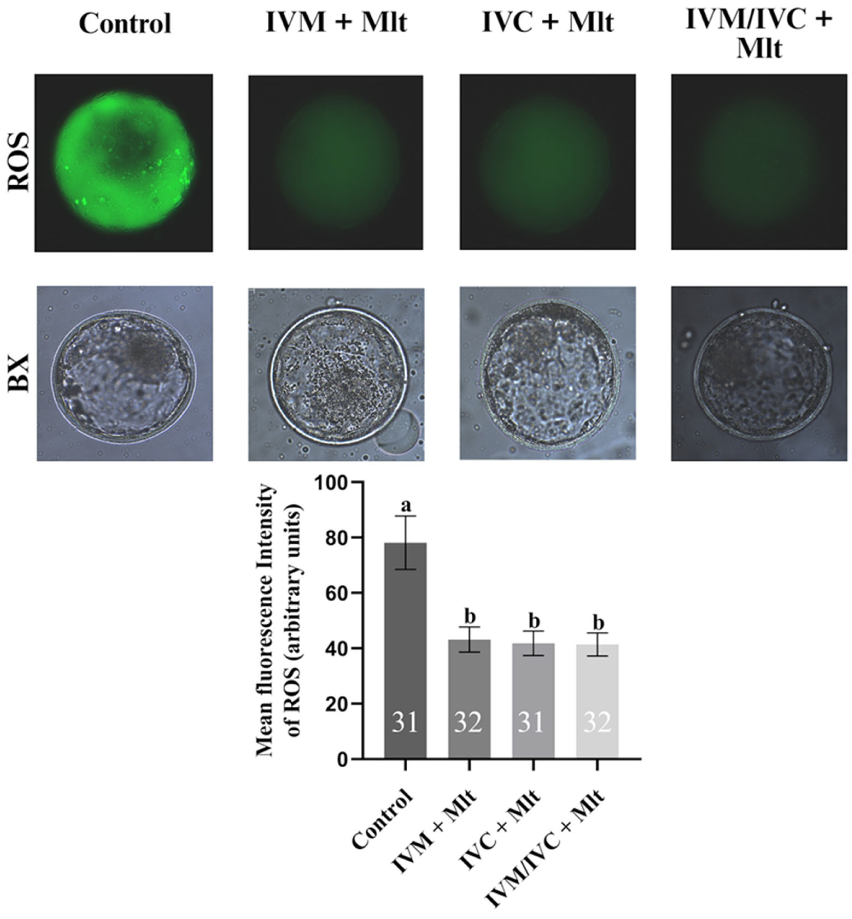 - Cavallari, F.D.C.; Leal, C.L.V.; Zvi, R.; Hansen, P.J. Effects of Melatonin on Production of Reactive Oxygen Species and Developmental Competence of Bovine Oocytes Exposed to Heat Shock and Oxidative Stress during in Vitro Maturation. Zygote 2019, 27, 180–186. [Google Scholar] [CrossRef] [PubMed]