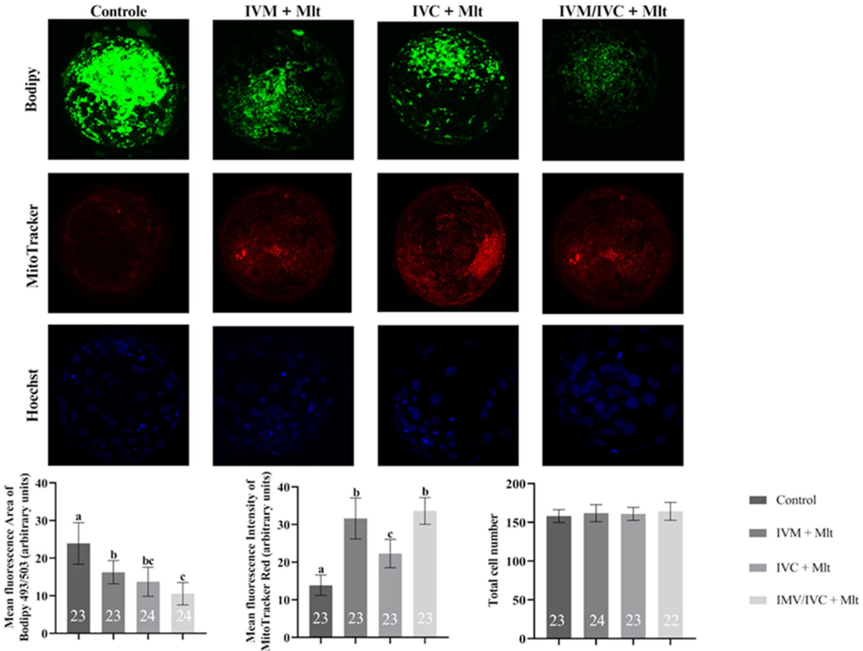 3.3. Effect of Melatonin on Mitochondrial Activity, Lipid Droplet Accumulation, and Total Cell Number
