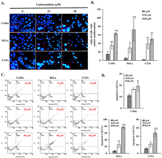To determine whether cepharanthine can induce apoptotic death and cell cycle arrest in cervical cancer cells. CaSki, HeLa, and C33A cells were exposed to 25 and 50 µM cepharanthine for 24 h and stained with Annexin V/PI and PI/RNase for flow cytometry analysis. Furthermore, cepharanthine-treated CaSki, HeLa, and C33A cells were also stained with DAPI and observed via fluorescence microscopy. As shown in Figure 2A,B, compared with the vehicle-treated controls, cepharanthine treatment significantly increased nuclear fragmentation and nuclear condensation in a concentration-dependent manner (CaSki cells, 14.5 ± 6.0 vs. 35.0 ± 7.3 vs. 63.2 ± 3.5; HeLa cells, 4.9 ± 2.1 vs. 29.2 ± 11.6 vs. 72.2 ± 26.4; C33 A cells, 1.5 ± 1.7 vs. 38.9 ± 11.6 vs. 50.1 ± 12.1, Table S1, p < 0.05) and significantly inhibited cell growth. Moreover, there were significantly more apoptotic cells in the cepharanthine treatment group than in the vehicle-treated control group (CaSki cells, 11.1 ± 1.3% vs. 16.5 ± 0.2% vs. 19.1 ± 3.9%; HeLa cells, 6.8 ± 1.8% vs. 24.8 ± 8.1% vs. 77.3 ± 3.3%; C33 A cells, 5.5 ± 1.1% vs. 10.9 ± 3.1% vs. 24.1 ± 4.0%; Figure 2C,D and Table S1; p < 0.05). In the cell cycle distribution assay, the highest concentration of cepharanthine (50 µM) significantly increased the percentage of G0/G1-phase cells from 45.5 ± 1.8% to 58.2 ± 1.2% in CaSki cells, and the percentage of sub-G1-phase cells significantly increased from 2.6 ± 0.9% to 68.0 ± 0.3% and 0.3 ± 0.1% to 35.4 ± 0.3% in HeLa and C33A cells, respectively (Figure 3 and Table S1, p < 0.05). These results suggested that cepharanthine-mediated suppression of cervical cancer cell growth was partly due to apoptosis and sub-G1- and G0/G1-phase arrest.