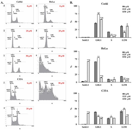 Cepharanthine induces cell cycle arrest at the sub-G1 and G0/G1 phases in cervical cancer cell lines. (A) Cell cycle distribution analysis through PI staining. CaSki, HeLa, and C33A cells were exposed to cepharanthine (0, 25, and 50 μM) for 24 h, followed by flow cytometric analysis. (B) Quantitative assessment of relative density percentages across cell cycle phases (sub-G1, G0/G1, S, and G2/M). The values are presented as the means ± SDs from triplicate experiments. * p < 0.05, ** p < 0.01, and *** p < 0.001 compared with the control (0.1% DMSO-treated cells); δ p < 0.001 compared with the Cep 25 μM treatment.