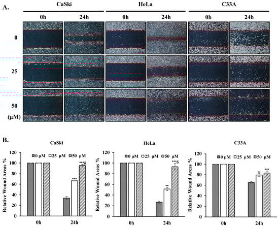 To examine the impact of cepharanthine on cervical cancer cell migration, we conducted a wound healing assessment. Our findings revealed a notable decrease in the migratory capacity of CaSki, HeLa, and C33A cells in the cepharanthine (25 and 50 µM) treatment groups compared with the vehicle-treated control groups at 24 h, by 33% and 62%, respectively, in CaSki cells, by 25% and 67%, respectively, in HeLa cells and by 14% and 18%, respectively, in C33A cells (Figure 4, p < 0.05). These results suggest that cepharanthine has antimetastatic effects on human cervical cancer cells.