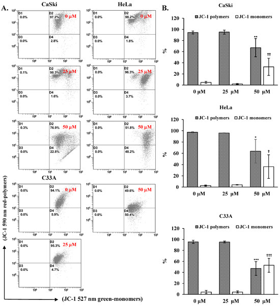 Cepharanthine induces mitochondrial membrane potential (∆ψm) depolarization in cervical cancer cell lines. (A) Assessment of ∆ψm via JC-1 staining methodology. CaSki, HeLa, and C33A cells were subjected to cepharanthine treatment (0, 25, and 50 μM) for 24 h, followed by flow cytometric analysis. (B) Quantitative evaluation of red-polymer (595 nm) and green-monomer (525 nm) fluorescence percentages. The data are presented as the means ± SDs from triplicate experiments. * p < 0.05, ** p < 0.01, and *** p < 0.001, comparing the control group with the polymer-treated group; † p < 0.05, †† p < 0.01, and ††† p < 0.001, comparing the control group with the monomer-treated group. Control, 0.1% DMSO-treated cells.
