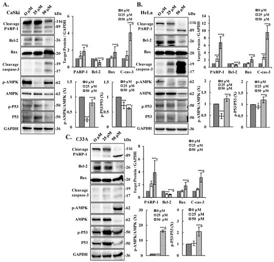 Cepharanthine induces apoptosis through the activation of apoptosis-associated proteins and AMPK/P53 phosphorylation in cervical cancer cells. CaSki (A), HeLa (B), and C33A (C) cells were subjected to cepharanthine treatment (0, 25, and 50 μM) for 24 h, followed by Western blot analysis of PARP-1, Bcl-2, Bax, cleaved caspase-3, total and phosphorylated AMPK, and P53 levels, with GAPDH as a loading control. The results of the quantitative analyses are presented in the plots on the right. The values represent the means ± SDs from three replicates. * p < 0.05 and *** p < 0.001 compared with the control (0.1% DMSO-treated cells); γ p < 0.01 and δ p < 0.001 compared with the Cep 25 μM treatment.
