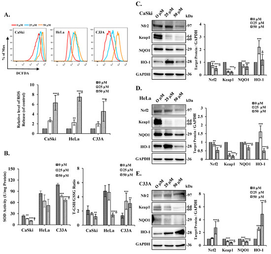 Effects of cepharanthine administration on oxidative stress markers in cervical cancer cell lines. CaSki, HeLa, and C33A cells were subjected to cepharanthine treatment (0, 25, and 50 μM) for 24 h. (A) Intracellular ROS levels were evaluated through flow cytometric analysis utilizing DCFDA staining. (B) ELISA was used to determine the SOD content and the GSH/GSSG ratio. (C–E) Western blot analysis was performed to assess the protein expression levels of Nrf2, Keap1, NQO1, and HO-1, with GAPDH as the internal reference. The quantitative analysis results are presented in the plots on the right. The values are expressed as the means ± SDs from three independent experiments. * p < 0.05, ** p < 0.01, and *** p < 0.001 compared with the control (0.1% DMSO-treated cells); † p < 0.05, γ p < 0.01, and δ p < 0.001 compared with the Cep 25 μM treatment.