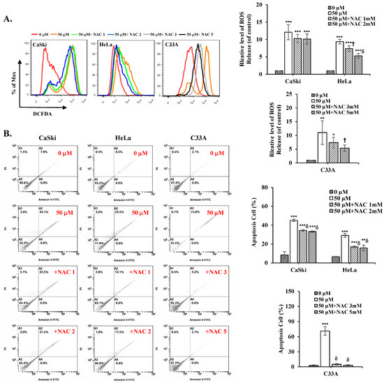 NAC inhibits ROS levels and reverses cepharanthine-induced apoptosis in cervical cancer cell lines. CaSki, HeLa, and C33A cells were subjected to cepharanthine treatment (0 and 50 μM) with or without NAC (1, 2, 3 and 5 mM) for 24 h. (A) Intracellular ROS levels were evaluated through flow cytometric analysis utilizing DCFDA staining. (B) Apoptosis detection via Annexin V/PI staining with flow cytometric analysis. The relative density percentage of apoptotic cells (encompassing both early and late stages) was quantified. The values are expressed as the means ± SDs from three independent experiments. * p < 0.05, ** p < 0.01, and *** p < 0.001 compared with the control (0.1% DMSO-treated cells); † p < 0.05 and δ p < 0.001 compared with the Cep 50 μM treatment.