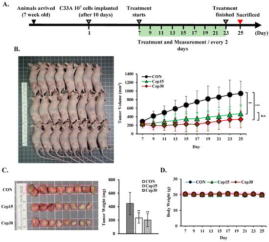 Twenty-four female BALB/c mice (7 weeks old) were obtained from the National Laboratory Animal Center (Taipei, Taiwan). The animals were maintained in a pathogen-free facility with controlled environmental conditions (22 °C, 12:12 h light/dark cycle). The experimental protocol received approval from the Institutional Animal Care and Use Committee (IACUC) of Changhua Christian Hospital, Taiwan (approval no: CCH-AE-112-008, accessed on 31 July 2023). Two parts of human cervical cancer C33A cells (1 × 107) were mixed with one part of Matrigel (#354248; Corning, Tewksbury, MA, USA), and 200 μL of this mixture was subcutaneously injected into the right flank of each animal. After the tumor volume reached approximately 250 mm3 (day 7), the mice tumor volumes were averagely assigned to three groups (n = 8/group). The groups received intraperitoneal injections (i.p.) of either vehicle control [150 μL, comprising 10% DMSO, 40% Cremophor/ethanol (C5135, Sigma-Aldrich), in PBS] or cepharanthine [15 or 30 mg/kg, dissolved in identical vehicle solution] every other day for 16 days (until Day 23). The cepharanthine doses used in this study were chosen on the basis of the previously published experiments [22,25]. Throughout the study, body weights and tumor dimensions were monitored using an electronic caliper. The tumor volumes were calculated according to the following formula: (length × width2)/2. Tumor volumes also were allowed to grow until the human endpoint criteria exceeded 2000 mm3, or the mice appeared with an ulcerated tumor or showed sick or moribund status, at which point the mice were euthanized. Otherwise, the mice were euthanized on day 25 in a CO2 chamber, followed by tumor excision and weight measurement for each group.