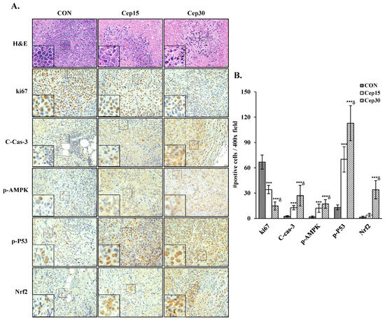 Cepharanthine decreases the protein expression of ki67, cleaved caspase3, p-AMPK, p-P53, and Nrf2 in C33A xenograft nude mice. (A) Representative histological sections of tumor samples subjected to hematoxylin and eosin, ki67, cleaved caspase-3, p-AMPK, p-P53, and Nrf2 staining (brown coloration; 400× magnification, scale bar = 20 μm). (B) The results of the quantitative analyses are presented in the plot on the right. The values are expressed as the means ± SDs (n = 8/group), which was conducted on three fields per specimen at 400× magnification utilizing ImageJ software. *** p < 0.001 compared with the control; δ p < 0.001 compared with the Cep 25 μM treatment. CON, control; Cep15, 15 mg/kg cepharanthine; Cep30, 30 mg/kg cepharanthine.