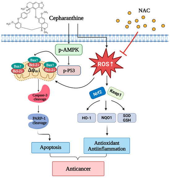 Schematic diagram of the anticancer mechanism of cepharanthine in cervical cancer through the AMPK/P53 and Nfr2/Keap1 pathways. Cepharanthine has an anticancer effect on human cervical cancer cells that is dependent on mitochondria-mediated intrinsic apoptosis through the modulation of the phosphorylating-AMPK/P53 pathway, upregulation of Bax expression, downregulation of Bcl-2 expression and induction of ROS production. Concurrently, cepharanthine increased ROS accumulation to induce oxidative stress by regulating the Nrf2/Keap1 pathway. NAC, an ROS scavenger, inhibited the ROS accumulation and reversed the apoptotic cell death of cepharanthine-treated cervical cancer cells. The chart drawing was performed using https://ailog.tw/lifelog/2021/06/10/picture-manager/ (accessed on 18 April 2025).