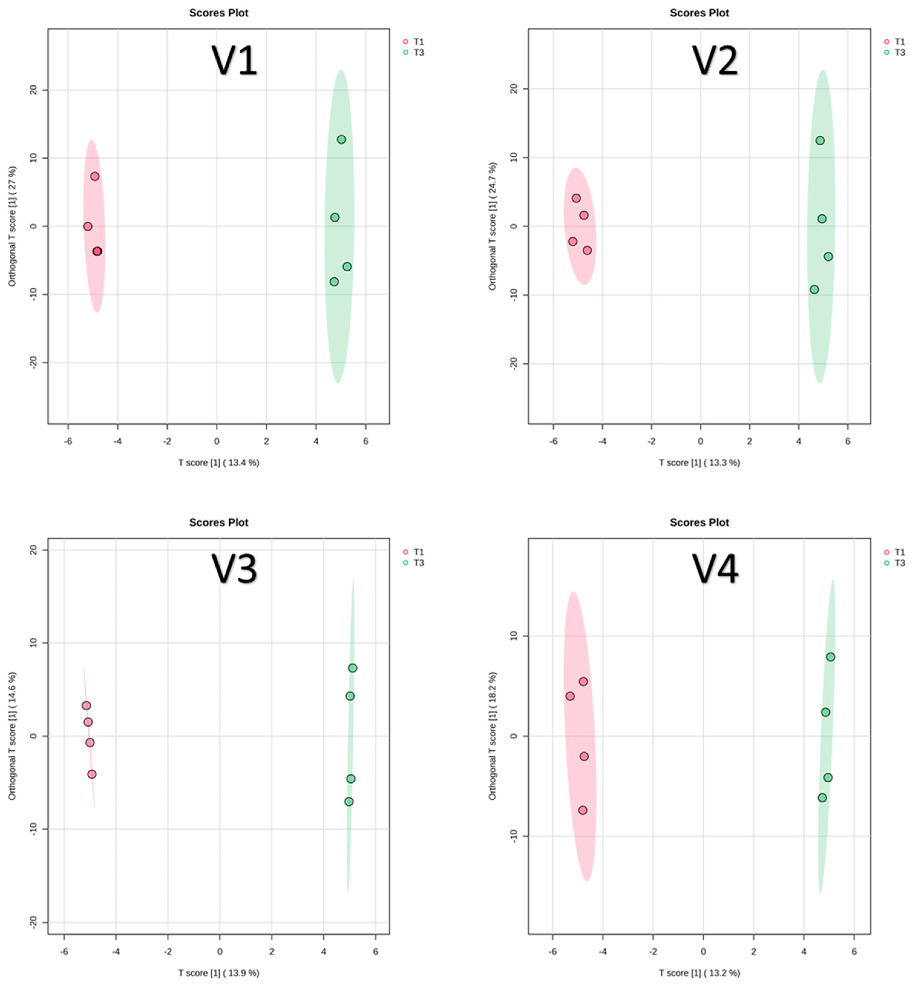 | p Value | FDR | V1/V4 | V2/V4 | V3/V4 | |||||