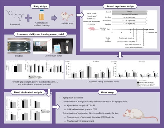 APA StyleChen, Y.-C., Chou, M.-Y., Li, P.-H., Lin, Y.-S., Yang, M.-D., Chi, C.-H., Huang, P.-H., Wei, Y.-J., Wang, M.-F., & Kuo, C.-Y. (2025). New Insights into Potential Anti-Aging and Fatigue Effects of a Dietary Supplement from the Resveratrol Beverage in Aged SAMP8 Mice. Antioxidants, 14(11), 1337. https://doi.org/10.3390/antiox14111337