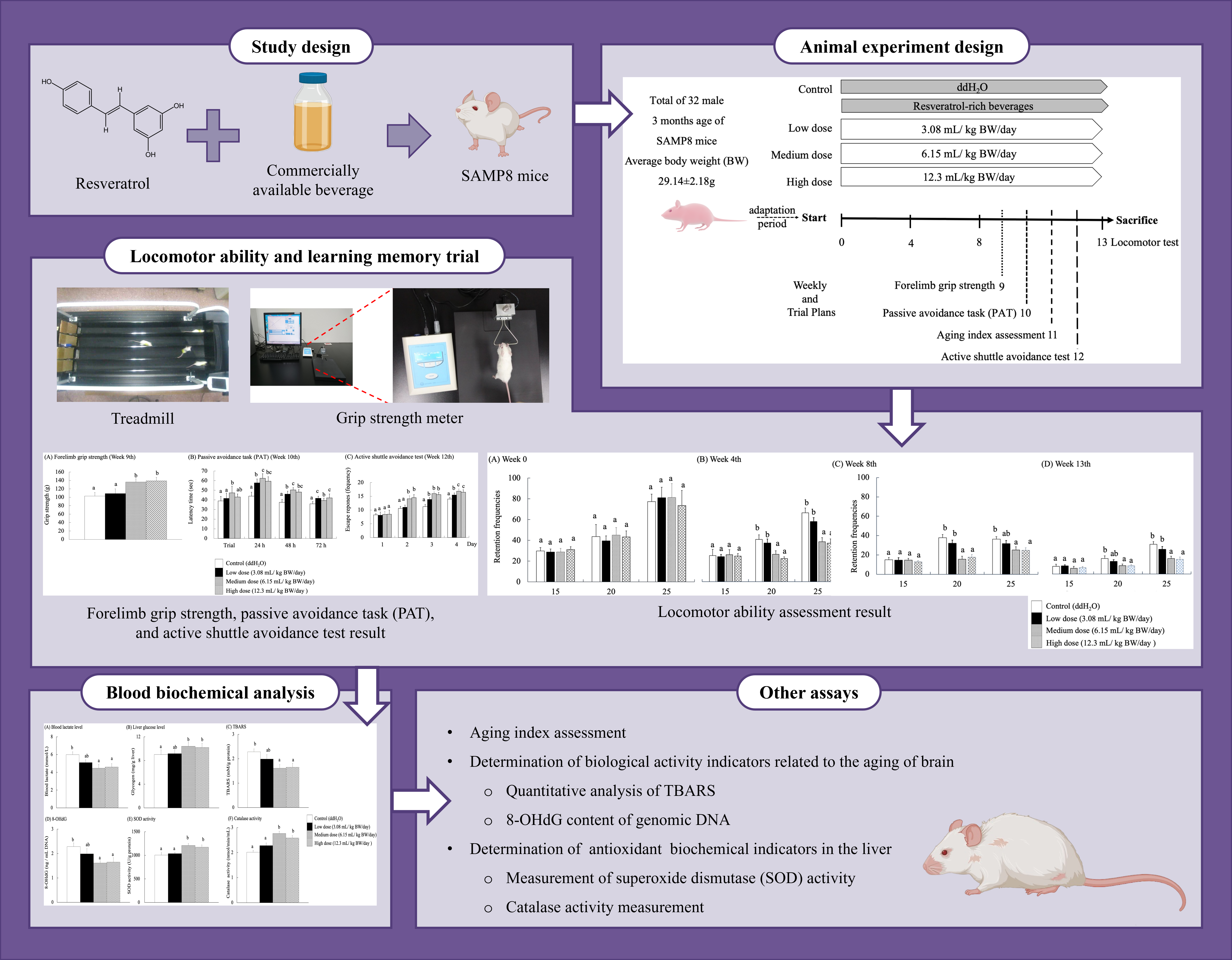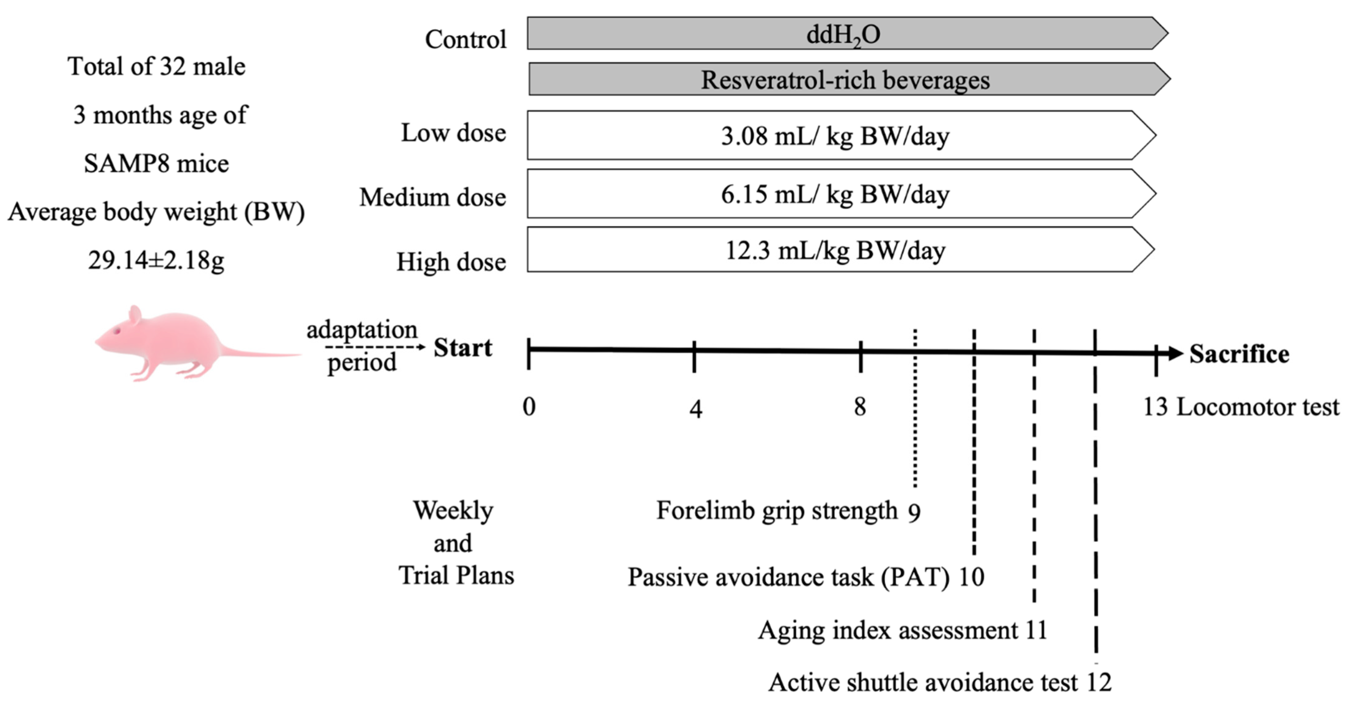 Chen, Y.-C.; Chou, M.-Y.; Li, P.-H.; Lin, Y.-S.; Yang, M.-D.; Chi, C.-H.; Huang, P.-H.; Wei, Y.-J.; Wang, M.-F.; Kuo, C.-Y. New Insights into Potential Anti-Aging and Fatigue Effects of a Dietary Supplement from the Resveratrol Beverage in Aged SAMP8 Mice. Antioxidants 2025, 14, 1337. https://doi.org/10.3390/antiox14111337