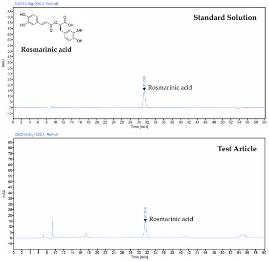 HPLC analysis determined that the concentration of rosmarinic acid in the TV extract was 7.2 mg/g. Quantification was performed by comparing the relative peak area of the extract to that of the standard solution, as shown in Figure 1.