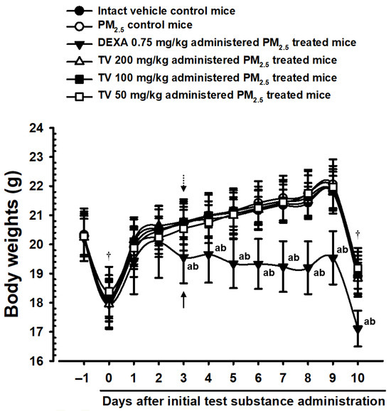 Body weight trends in intact or PM2.5-treated pulmonary-injured mice. Values represent means ± SD for 10 mice per group. PM2.5 refers to Diesel Particulate Matter NIST 1650b; DEXA indicates dexamethasone treatment; TV refers to thyme (Thymus vulgaris L.) leaf extract; THSD denotes Tukey’s Honest Significant Difference test. Body weights were monitored from one day prior to the first administration (Day-1) until 24 h after the 10th administration (Day-10). All mice were fasted overnight before the initial administration and at sacrifice. Arrows in the figure indicate significant decreases in body weight following DEXA administration (0.75 mg/kg) relative to intact vehicle control (†), and dot arrows indicate reductions compared with PM2.5 control mice. Significant differences are indicated as follows: a p < 0.01 vs. intact vehicle control (THSD test); b p < 0.01 vs. PM2.5 control (THSD test).