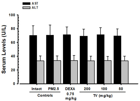 No markable differences in serum AST and ALT amounts were observed in PM2.5-exposed mice or any treatment group, suggesting that neither PM2.5 exposure nor TV administration caused hepatotoxicity under the study conditions (Figure 4). AST changes were minimal (0.57% in PM2.5 control vs. intact control), and ALT changes were similarly negligible (0.60%), confirming systemic safety of TV treatments.