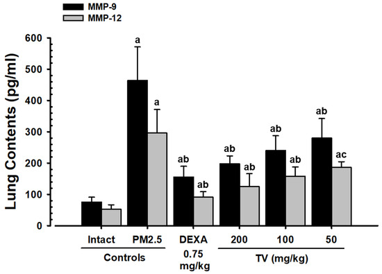 Lung MMP content in intact or PM2.5-treated mice. Values represent means ± SD for 10 mice per group. PM2.5 refers to Diesel Particulate Matter NIST 1650b; DEXA indicates dexamethasone treatment; TV refers to thyme (Thymus vulgaris L.) leaf extract; MMP indicates matrix metalloproteinase; DT3 refers to Dunnett’s T3 test. Statistical significance is indicated as follows: a p < 0.01 vs. intact vehicle; b p < 0.01, c p < 0.05 vs. PM2.5 control (DT3 test).