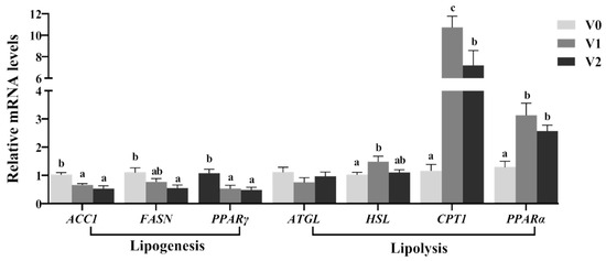 The mRNA levels and enzymatic activities of genes related to hepatic lipid metabolism were presented in Figure 3 and Table 7. In the V1 and V2 groups, the mRNA levels of genes involved in hepatic lipogenesis (ACC1, FASN, and PPARγ) were significantly downregulated compared to the V0 group (p < 0.05). Conversely, the mRNA levels of genes associated with TG hydrolysis (HSL) and β-oxidation (PPARα and CPT1) were significantly upregulated (p < 0.05), while no significant differences were noted in ATGL mRNA levels (p > 0.05). Reflecting the mRNA expression patterns, the enzyme activities of ACC1 and FASN were significantly lower in the V1 and V2 groups (p < 0.05), whereas HSL and CPT1 activities showed significant increases (p < 0.05), with no significant difference noted for ATGL (p > 0.05).